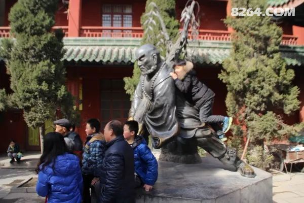 | 山门之后有鲁智深倒拔垂杨柳的雕塑。《水浒传》里说,鲁智深到东京大相国寺看守菜园子。菜园子附近住着二、三十个泼皮,他们常来菜园子偷菜,已换了几个看园子的人都管不了他们。他们这次听说又换了个新人,便来闹事。没想到被鲁智深把两个领头的踢到粪坑里,吓得他们跪地求饶。第二天,泼皮们买些酒菜向鲁智深赔礼。大家正吃得高兴,听到门外大树上的乌鸦叫个不停,泼皮们说这叫声不吉利,吵的人心烦,便欲搬梯子拆掉鸟巢。鲁智深上前把那棵树上下打量了一下说:"不用了,待我把树拔掉。"说完,只见他脱掉外衣,用左手向下搂住树干,右手把树的上半截,腰往上一挺,那棵树竟然连根拔起。众泼皮惊得个个目瞪口呆,忙跪在地上拜鲁智深为师。(这个故事可以看出几个问题。第一,大相国寺当时拥有一大批产业,而寺庙外有些老百姓生活水平应该很不高,穷到要经常到寺庙偷菜,而当时老百姓的素质也不高。我想今天的老百姓应该不会有谁整天不务正业,经常到菜园偷菜)