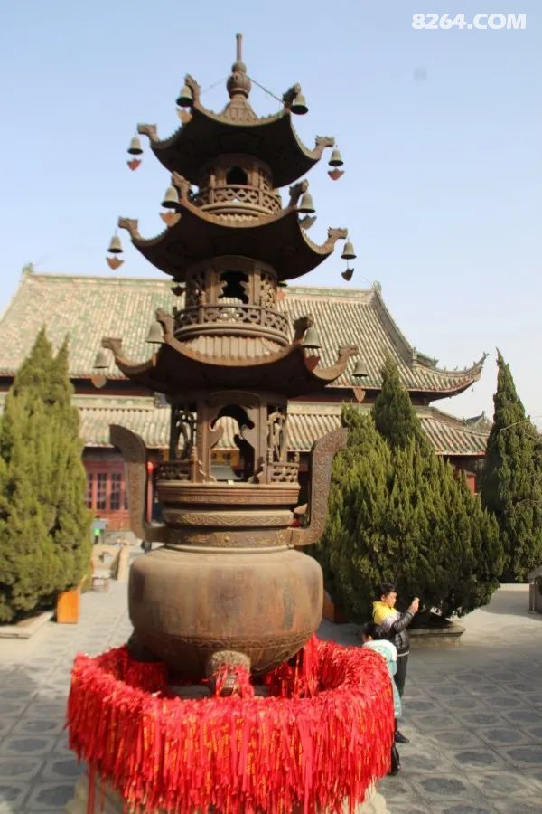 | 天王殿内供奉风调雨顺四大天王。他们分别是东方持国天王、南方增长天王、西方广目天王、北方多闻天王。他们是佛教的护法神。中间是佛祖的接班人的弥勒佛,弥勒身后是韦陀菩萨,他也是佛教的护法神。我注意到开封的寺庙风俗和合肥不一样,合肥和江浙一带的寺院(明教寺、开福寺、灵隐寺、寒山寺、鸡鸣寺),韦陀菩萨用金刚杖着地,通过金刚杖指向身前、直立、后来表示寺庙提供食宿、只提供饮食、不提供食宿。而据导游说开封佛寺的韦陀菩萨用金刚杖指地面、两手端着平放、指上天表示表示提供饮食、提供食宿、不提供食宿。大相国寺的韦陀是将金刚杵平放胸前的,表示可以接待僧人,提供饮食住宿。(网上说法很多,而导游是这样说的)还要说明的是开封的寺庙道观里僧人对拍照特别反感,有和尚用不那么友善的眼光看着拿相机的我,虽然我不信佛教,但是为了避免引起这些人反对。还是没拍佛像。