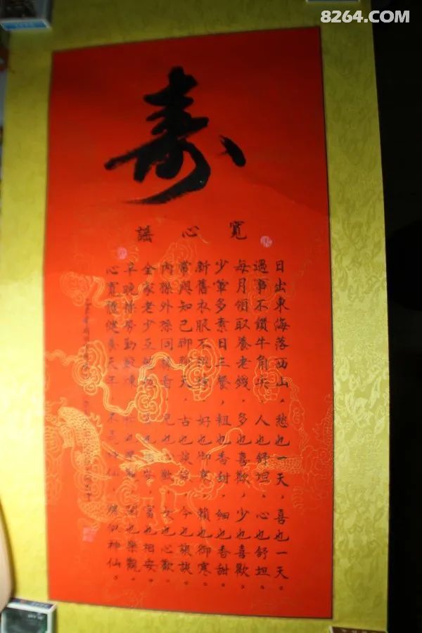 然后逛完中轴线来到西边的廊庑,导游推销商品,里面有个叫李项羽的上海书法家在这里当义工,这幅书法卖150元,他是方丈邀请来的,自愿为寺庙做功德,卖每幅作品的钱捐6成给寺庙,四成留给自己。我当时觉得这个给爷爷奶奶也不错,他们春节看不到我大概会感到寂寞。这个作品说不定还有收藏价值,即使不值钱还能让老人高兴,就买了这个《宽心谣》,这里不带挂轴的,带框的作品要200元。李老师说这个作品太短,挂起来不好看。然后应我的要求很自信认真的把作品捆好,套上塑料袋,再装入纸盒。后来回来以后我把这个给了爷爷奶奶。