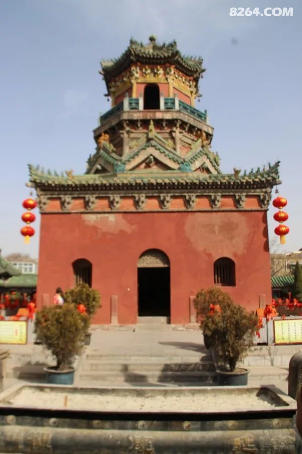 | 进入院落以后看见一位美女讲解员,跟在她后面听,看样子导游姐姐服务很热情,没想到她正在介绍最后一个景点,两分钟以后就回到办公室休息了,……看到两个30多岁大叔在讲解这个玉皇阁,但是我不感兴趣。于是我就自己逛了。 玉皇阁,又叫通明阁,占地约76平方米,始建于元太宗五年(1233年),已有近800年的历史。玉皇阁座北朝南,通高18.25米,分为上、中、下三层,全部是由青砖、青石和琉璃瓦件砌成,整个建筑不施梁木,结构严谨,富于变化,是一座汉蒙文化巧妙结合、具有元代特征的明代无梁阁 ,在中国道教史、建筑史、艺术史、民族关系史上占有重要地位。 玉皇阁第一层(下层)为正方形,四四方方,四平八稳。外部为四坡檐顶,在檐脊上方还雕有标志等级制度的五个走兽,分别是:龙、凤、狮、马、鱼。雕刻生动形象,栩栩如生。它一方面是五行的象征,金木水火土,另外也是古代等级制度的体现。第二层是一个八棱形的实体,这种从四方形向八棱形的突然转变,在古代建筑史上是十分少见的,在八棱形的四周用碧绿的琉璃瓦砌出了连续的山花,像一座座高大的山脉波澜起伏。在每个山尖上都有一个龙头,龙头朝里,在龙的背上插有一把箭柄,古人们认为鸱吻五行属水,将其放在房脊上可以起到镇除火灾的作用。其背上的剑,是为了起到装饰和加固房脊的作用。山面上砌出正脊吻兽、垂脊、扶风、悬鱼等,垂体结构为仿木的柱仿、斗拱、阑额等以承托上层平座。整个中层从外观来看内外互不相连高低相应浑然一体,并且每一层的装饰都互不遮挡。第三层是一个八角形的亭阁,亭子的正南门门楣上有一块匾额,上面写着玉皇阁三个大字。在亭子里面供奉着中国珍贵文物,汉白玉雕玉皇大帝,玉皇阁的二三层与底部之间是没有阶梯可供攀登,既体现了玉皇大帝不食人间烟火,超然世外的神仙地位,又使人觉得玉皇大帝高高在上,高不可攀,增添了一种神秘之感。 玉皇阁采用砖墙穹顶结构,元代穹顶在伊斯兰教建筑中使用较为普遍,但在道教建筑中较为罕见,玉皇阁是研究西域伊斯兰教建筑形制与风格对中土建筑影响及元明中国砖石拱顶建筑嬗变的重要实物,外观具有浓厚的中国传统木构建筑的风貌,具有极高的文物价值和科学、艺术价值。 玉皇阁既是汉蒙文化巧妙结合的产物,同时,对研究中国元代的文化艺术、建筑特点也有重要意义。而且使开封地区自宋朝以来的古代建筑保持了宋、元、明、清的完整序列,没有出现遗憾的空白。