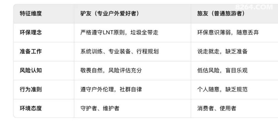 ËÄ¡¢¸ÅÄî³ÎÇ壺רҵ¿ÓÑÓëÆÕͨÓο͵ı¾ÖÊÇø±ð ÐÐΪ¹æ·¶µÄÃ÷ÏÔ²îÒ죺 רҵ¿ÓÑÆÕ±é×ñÊØ¡°ÎÞºÛɽÁÖ¡±ÔÔò£¬ËùÓÐÀ¬»ø×ÔÐдø×ߣ¬ÇÒ¶ÓÓѼäÏ໥¼à¶½£»¶øÆÕͨÓοÍÍùÍù»·±£Òâʶ±¡Èõ£¬ËæÒⶪÆúÏÖÏóÑÏÖØ¡£ÕâÊÇÁ½ÀàÈËȺ×îÏÔÖøµÄÇø±ð¡£